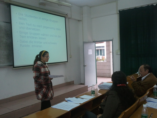 为推进我院外语教学改革,提高英语、日语和德语的教学水平,促进外语系新入职教师的成长,外语系于2012年11月30日下午开展了2012年度新入职教师教学比赛,本次比赛由各语种教授、副教授和教研室主任担任评委。外语系主任胡光忠观看了本次比赛。