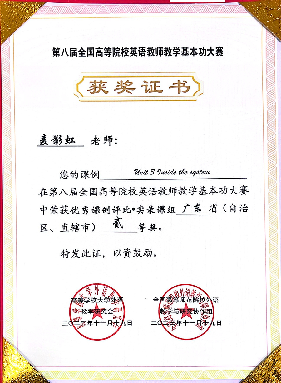 近日,第八届全国高等院校英语教师教学基本功大赛在浙江工业大学圆满落幕,我校suncitygroup太阳新城麦影虹老师荣获实录课组省级二等奖。