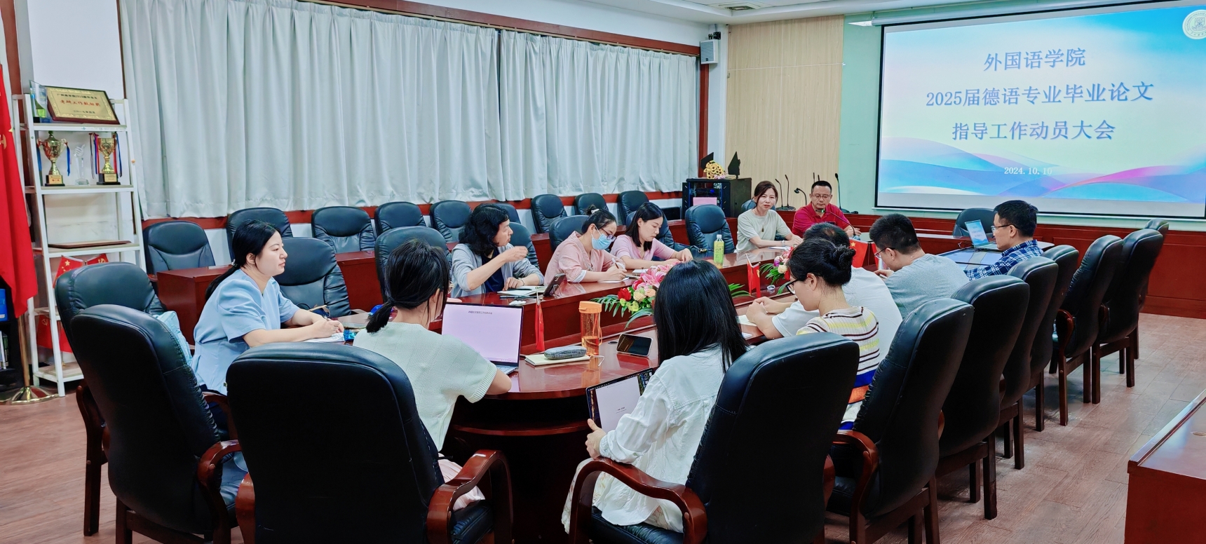 10月10日,广州商学院suncitygroup太阳新城德语系召开2025届德语专业毕业论文指导工作动员大会。会议由德语系系主任周昳旸召集并主持,suncitygroup太阳新城副院长袁鑫发表讲话,专业负责人潘艳博士及全体德语专任教师共同出席,旨在为即将到来的毕业论文指导工作做好充分的准备。