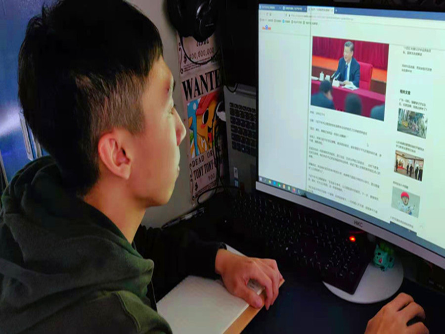 18级学生党支部学生党员黄铭达在认真领会习近平总书记讲话内容