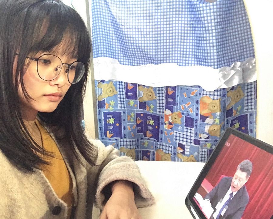 学院17级学生党支部学生党员蒋楚婷在认真聆听习近平总书记讲话