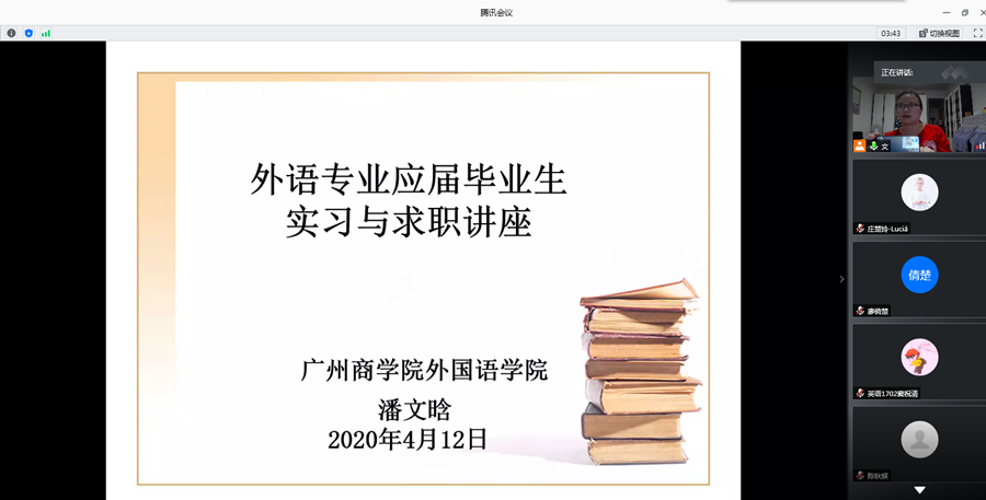 接下来是潘文晗老师进行毕业生实习与求职讲座。潘文晗老师肯定了廖倩楚同学的经验分享,并从就业政策、实习、写好求职信三个方面分别和大家进行分享。一是现在国家对大学生工作就业有许多优扶政策,我们也需要去官方网站上积极了解就业政策;二是实习与就业的关系十分紧密,选择实习和职业需要考虑社会需求等多个方面;三是写好求职信和远程面试有技巧,大家要注意培养自己的主动求职意识,遇到合适的工作机遇要善于主动把握,最后她还为大家提出了与外语专业岗位相关的中肯且有用的建议和忠告。