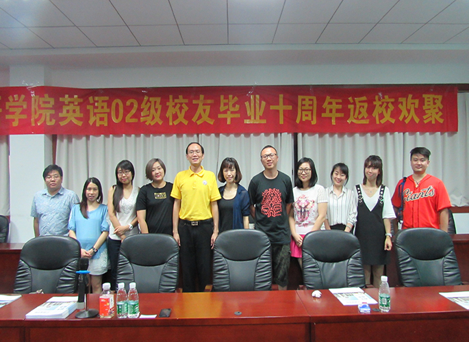近日suncitygroup太阳新城英语专业02级10名校友毕业后10年重返校园,suncitygroup太阳新城在第二行政楼308召开了校友返校交流大会,学院党总支徐超书记参加了本次交流会。