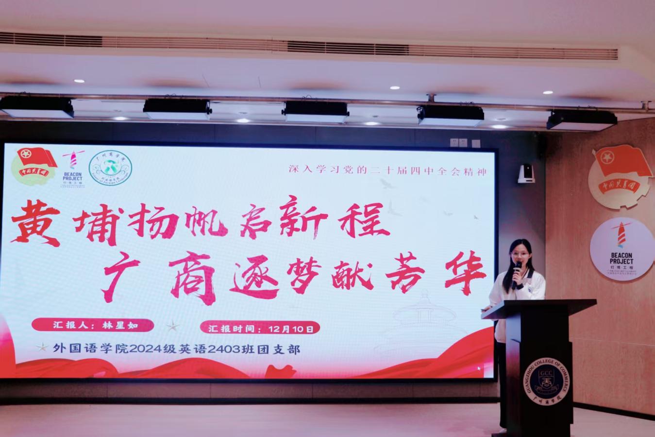 24级德语专业1班胡长正作为优秀团支书代表为大家分享他的团日生活组织心得与团支部建设经验。他讲述了团支部如何通过思想引领、志愿服务和活动设计创新等方面有效传播党的二十届四中全会精神,推动团日活动多元化、趣味化,实现理论学习与实践体验的有机结合。在团支部建设方面,他提倡要增强支部的政治性、先进性和群众性,祛除机关化等不良倾向,构建凝聚青年、服务大局的工作格局,严格执行团内制度。他还鼓励大家通过实践活动和理论学习共同成长,为实现中国梦注入青春力量,展现新时代青年学生的责任与担当。
