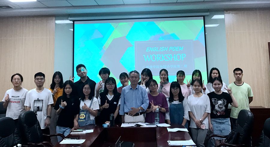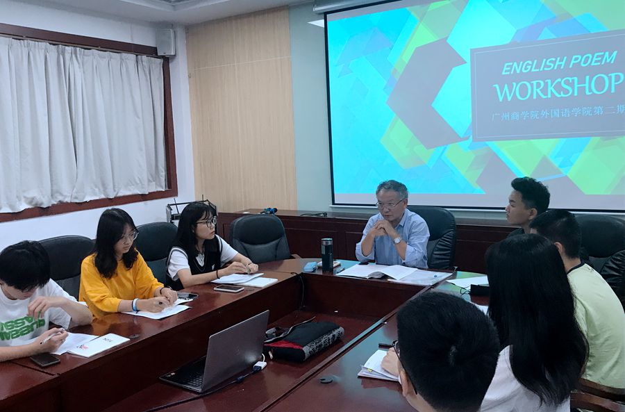 上学年我院面向2017、2018级举办了第一期“英诗朗诵工作坊”,在学生中的反响很好,特在本学期举办第二期工作坊,共有24位2019、2020级英语专业的同学报名参加。王教授为复旦大学比较文学博士,广东外语外贸大学外国文学文化研究中心研究员,博士生导师,也广州商学院suncitygroup太阳新城英语系专业负责人,文学造诣深厚。本工作坊的宗旨是寓教于乐,在“玩耍”中学习英国文学的王冠——英诗。本工作坊从11月-12月共举行了4次活动,每次活动会安排4首要朗诵的诗歌,先由王教授讲解该次活动的诗歌的大意、背景等知识,然后安排同学们朗诵,再对诗歌的特点、意境等进行讨论。