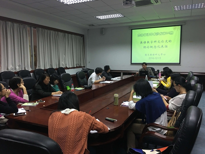 讲座一开始,曾教授对商务英语系伍彩芬老师在我校“第3届中青年教师教学大赛”中获得第一名的好成绩予以充分的肯定,请伍彩芬老师用简短的语言对自己课程设计的思想进行总结,由此引入了今天沙龙的主题——英语教学研究论文的理论概念化表征,指导教师们如何把教学实践的经验上升为概念,形成自己的教学理论。