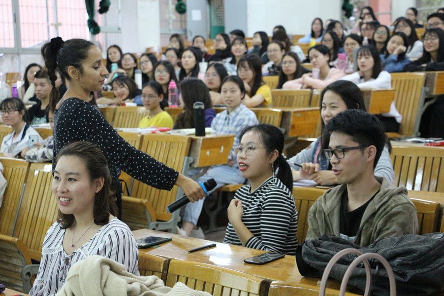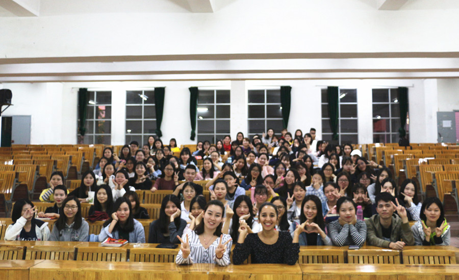 梁颖虹结合自身的西班牙留学经历、图文并茂的PPT、经典影片《看不见的客人》和旅游宣传片,形象生动地介绍了西班牙的节日、美食、文化和风景。特色的传统节日、琳琅满目的美食、浓郁的历史文化底蕴、独具创意的古迹风景,随着风趣幽默的讲解,同学们深深沉浸在西班牙文化中。接着,她介绍了西班牙的教育体系、语言学习等级,让同学明晰了西班牙语的学习目标,此外,结合数据分析,梁颖虹还分析了西班牙语人才前景和社会需求、就业走向和行业分布,坚定了同学们学习西班牙语的信心。外教María José在讲座中分享了在西班牙康普顿斯大学的心路历程,介绍了西班牙的学习模式;与同学们亲切互动,引导同学们感受西班牙语的语言魅力;为同学们表演西班牙歌曲,带领同学们体验西班牙的文艺情怀。讲座会场,时而齐声朗读西班牙句子,时而认真欣赏西班牙经典影片,时而深情吟唱西班牙歌曲,氛围其乐融融。