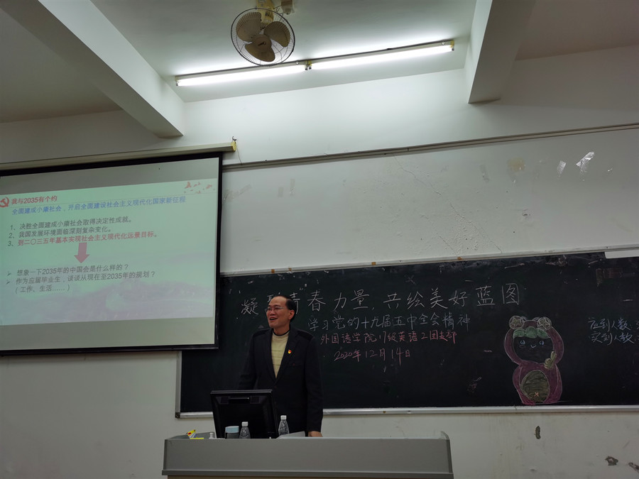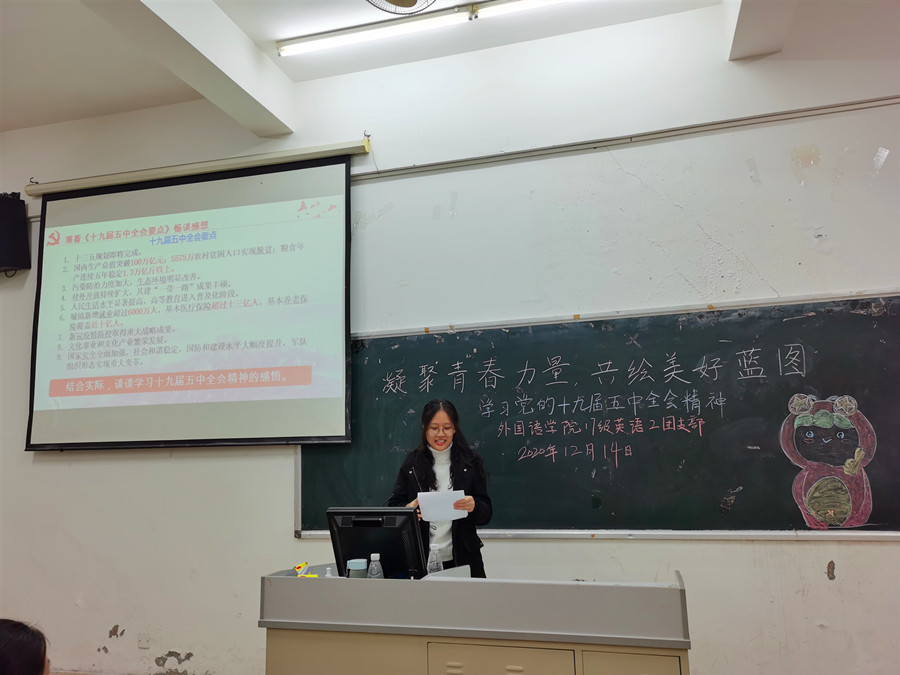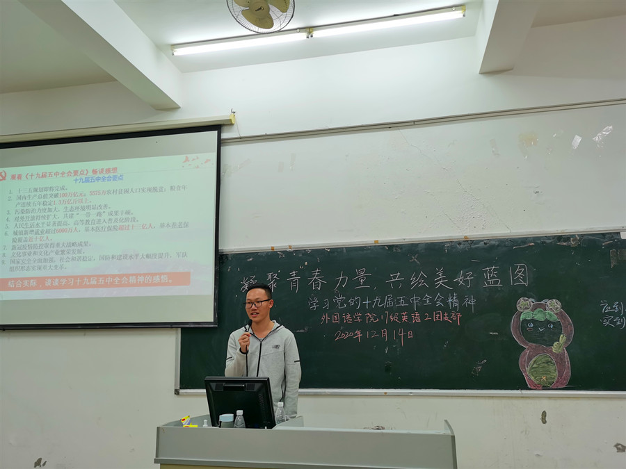 为全面贯彻党的十九届五中全会精神,深入理解党和国家事业取得的非凡成就,领悟习近平新时代中国特色社会主义思想的实践伟力,suncitygroup太阳新城17级英语2团支部于12月14日19时30分在四教110召开“学习党的十九届五中全会精神”主题团日活动,与会嘉宾有结对子老师黄弢校长、suncitygroup太阳新城党总支徐超书记及17级英语专业辅导员刘丽老师,活动由团支书林晓莉主持。