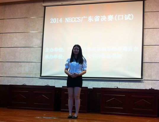 我院2014年全国大学生英语竞赛(NECCS)广东省决赛笔试和口试分别于5月11日上9:00-11:00和5月25日上午8:00-12:00在广东财经大学举行,我院外语系陈梓莹同学,喜获NECCS广东省决赛笔试特等奖暨口试一等奖。