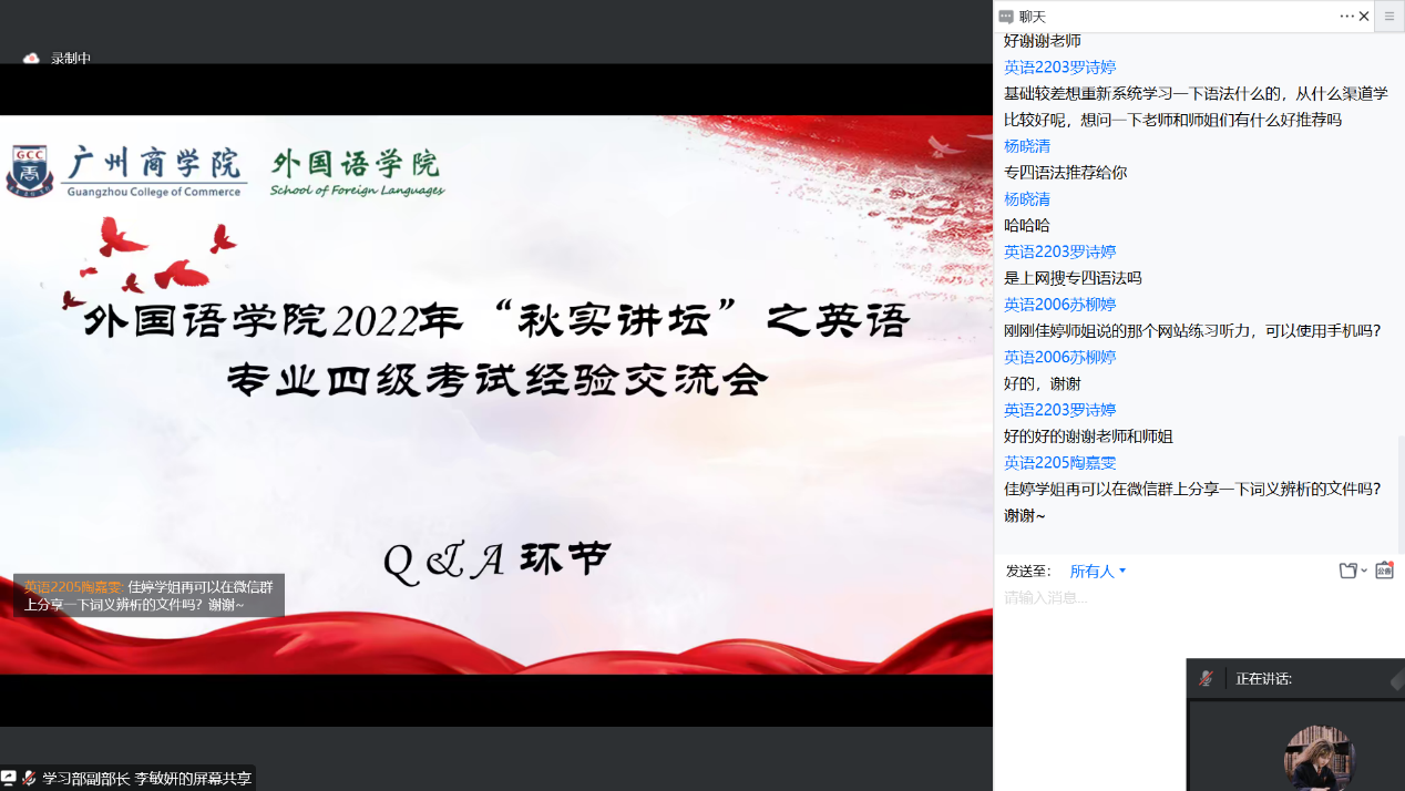 此次交流会分为教师指导和优秀考生分享两大部分。商务英语系专任教师秦思莹从出题人、监考人和阅卷人三个角度对英语专业四级考试进行了多方位解读分析,针对同学们平时的易错点和重难点提出了多项有效的应对策略。学生嘉宾张佳婷、钟佳文针对词汇与语法、完型、阅读与作文四个板块,结合自身实际经验分别进行了分享。
