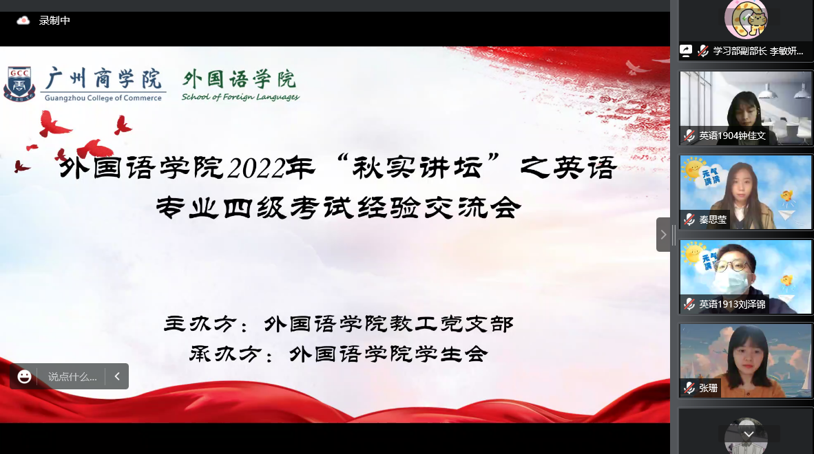 为提升外语专业人才培养质量,精准有效地做好专业考级考证指导,积极响应“不忘初心、牢记使命”主题教育的号召,我院教工第一党支部、院学生会于12月1日通过“腾讯会议”平台举办了2022年“秋实讲坛”系列讲座之英语专业四级考试经验交流会。suncitygroup太阳新城教工第一党支部书记、商务英语系专任教师何瑞玉、商务英语系专任教师张珊以及200多名学生参加了此次讲座。