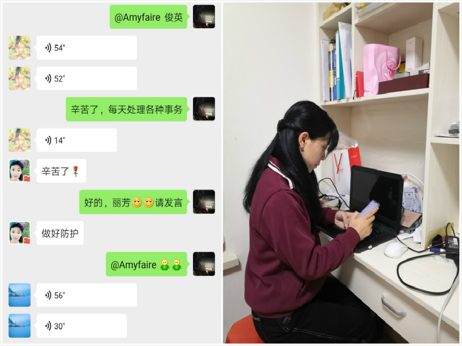 洪希琳老师假期在休产假,结合切身体会,她表达了对抗击疫情一线的医护人员的衷心感谢。李琦老师现在英国,仍然主动承担了六个教学班的网课任务,战胜时差,按时完成线上课程教学任务。