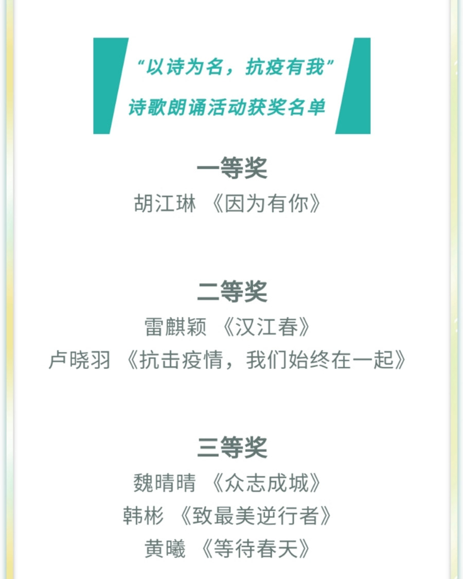 疫情面前,人人有责。本次活动,不仅鼓励了同学们以积极向上的精神面貌参与到疫情防控工作中,为抗疫行动加油助威,也丰富了同学们的居家生活,为同学们搭建了展示自我才华的线上平台,大家以铿锵有力的声音,饱含深情的朗读,表达对抗疫英雄的赞美与敬意,展示出我院学子共同抗疫的坚定信心。