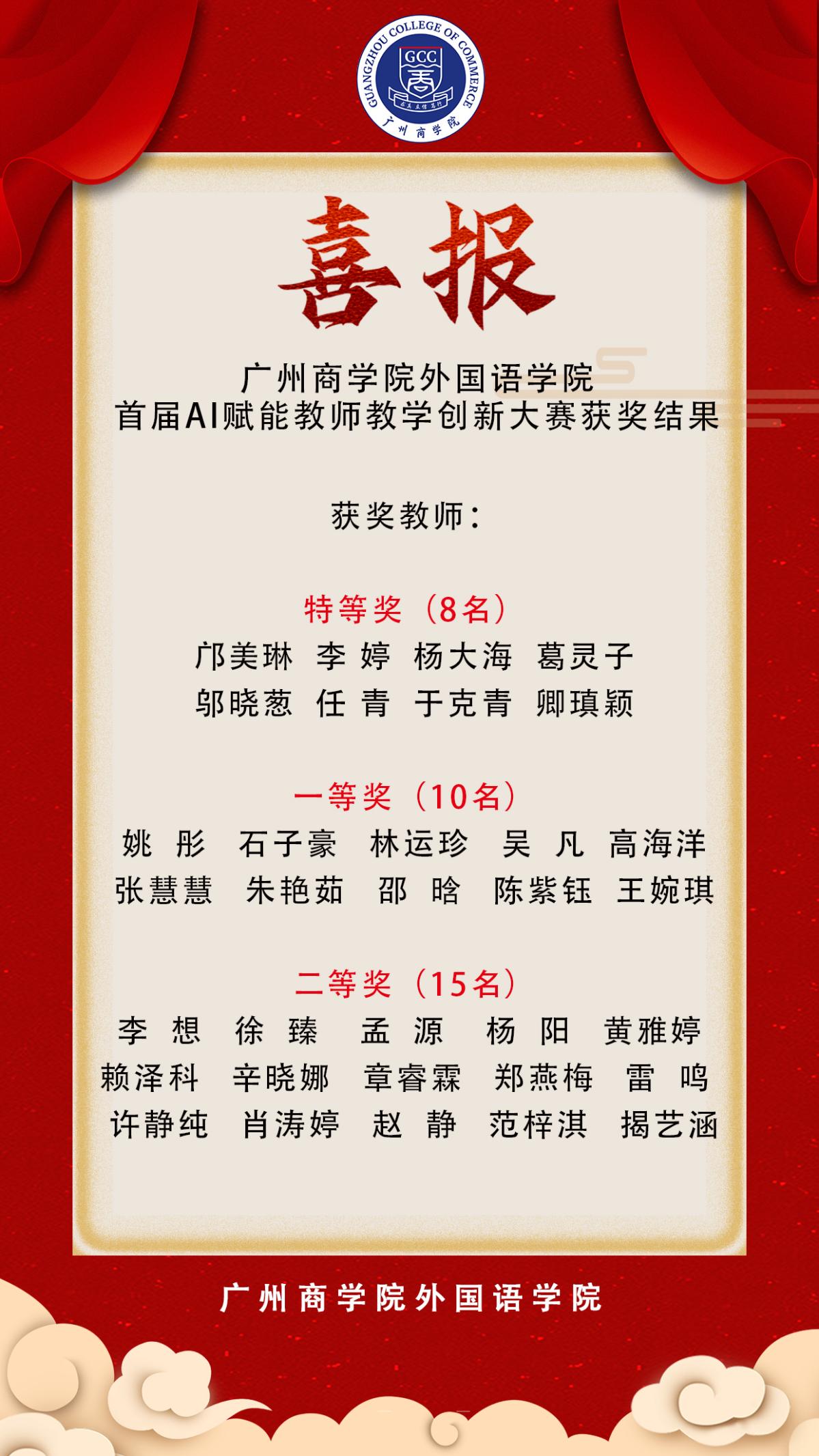 经过多环节的激烈比拼,大赛最终评选出特等奖8名,一等奖10名,二等奖15名,其中获得特等奖的8位老师,将代表suncitygroup太阳新城参加广州商学院首届AI赋能教师教学创新设计大赛。