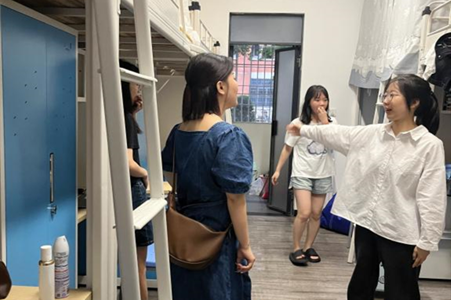 陈丽珊(右一)走访宿舍