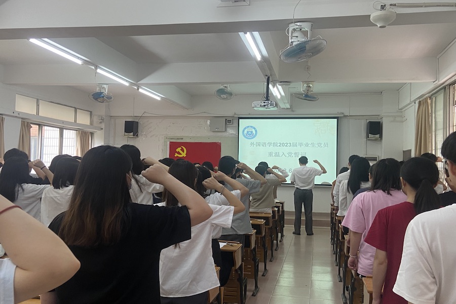 徐超作为领誓人带领全体党员重温入党誓词,毕业生党员们面向党旗庄严宣誓,在铮铮誓言中重温入党初心,坚定理想信念,牢记职责使命。