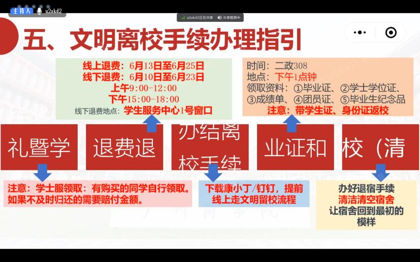 会上,毕业班辅导员李超老师从理想信念教育、诚信教育,安全教育、心理健康教育、爱校荣校教育着手,强调毕业生需要重视思想建设。紧接着,李超老师详细解读毕业典礼、离校手续、毕业材料、党团关系、征兵入伍等方面注意事项,简化毕业流程手续,扩宽学生就业渠道。