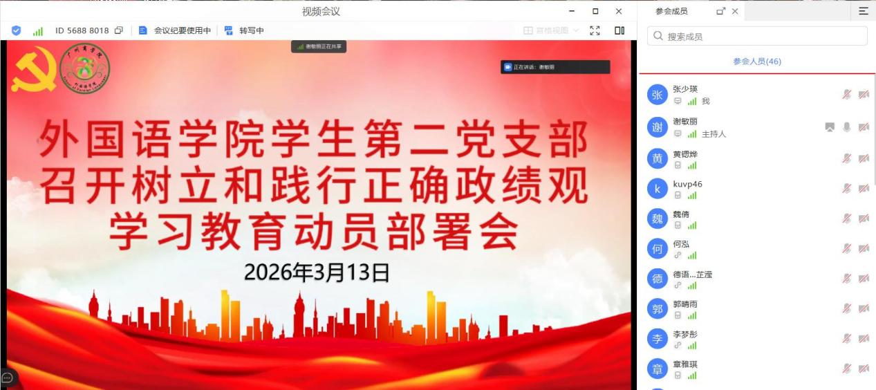 3月12日,suncitygroup太阳新城学生第二党支部召开树立和践行正确政绩观学习教育动员部署会,深入学习贯彻相关精神,统筹推进学习教育走深走实。党支部书记谢敏丽主持会议并作动员部署,组织委员李思浩、宣传委员庄菲菲、教师党员陈钰洵以及支部全体学生党员参加会议。