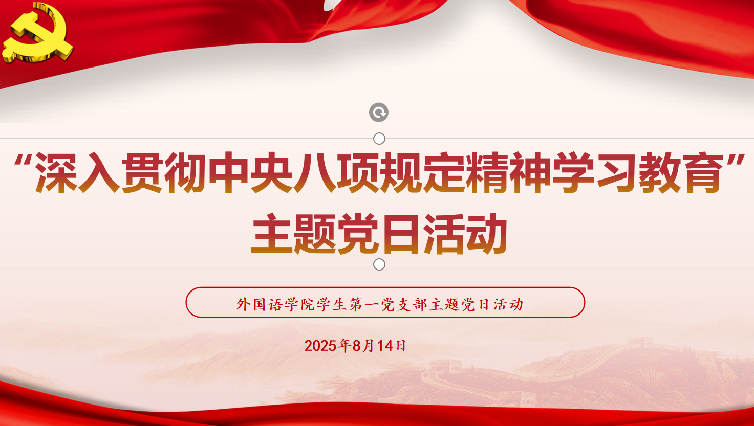 为扎实推进深入贯彻中央八项规定精神学习教育,进一步强化纪律作风建设,suncitygroup太阳新城学生第一党支部于8月14日晚20:00在腾讯会议线上集中开展主题为“深入贯彻中央八项规定精神学习教育”的主题党日活动,支部全体党员参加本次线上党日活动,王胤凯同志担任本次党日活动主讲人。